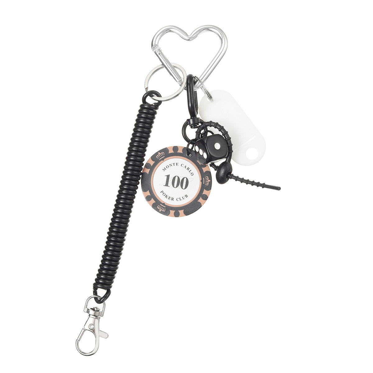 This Monte Carlo Poker Chip Bag Charm blends novelty and style with a coiled cord accent and casino-inspired details. Featuring a faux poker chip, mini dice, and plastic tag, this charm adds a fun, edgy touch to any accessory collection. Its bold design and heart clip make it perfect for trend-forward displays, game-night themes, or playful retail assortments.