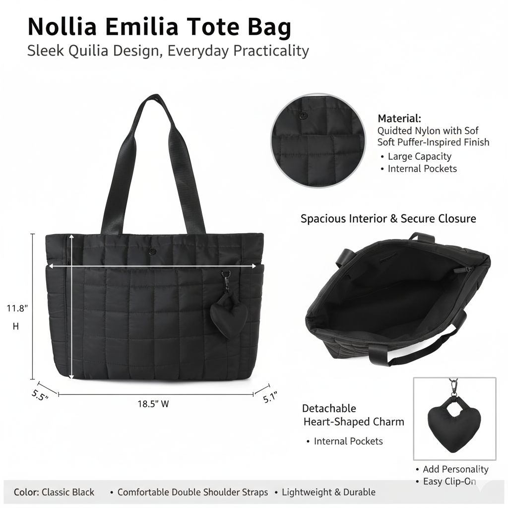 The Nollia Emilia Tote Bag combines a sleek quilted design with everyday practicality. Made from lightweight nylon with a modern puffer finish, this spacious tote is perfect for work, travel, or daily errands. The detachable heart-shaped charm adds a playful accent, while the roomy interior and zipper closure keep your essentials secure.
