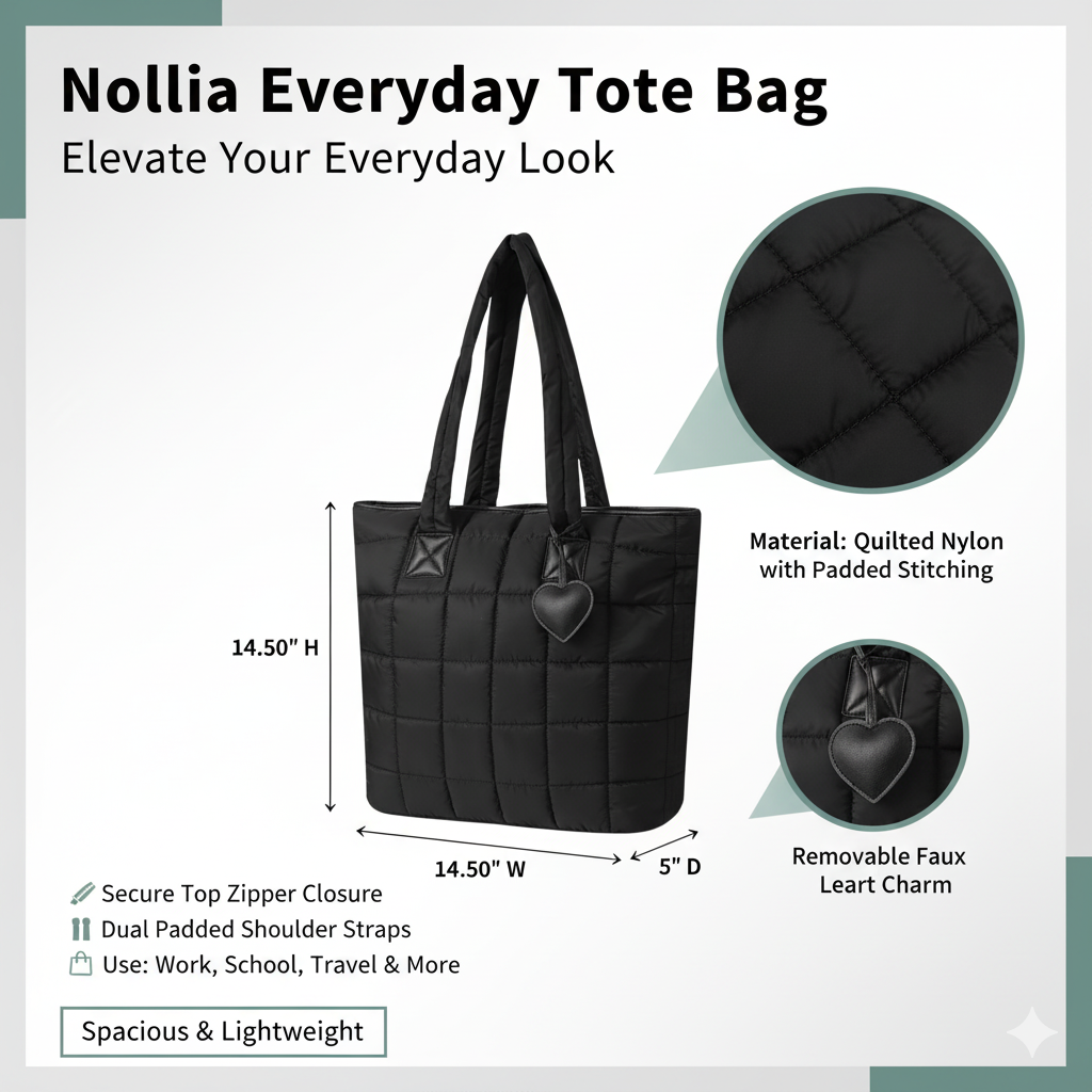 Elevate your everyday look with the Nollia Everyday Tote Bag, designed with a sleek quilted finish and versatile black color. This spacious tote is crafted from durable nylon with soft padded stitching, giving it a modern puffer-style aesthetic while remaining lightweight and practical. It features long shoulder straps for comfortable wear, a full zip closure to keep your essentials secure, and a glossy faux leather heart charm for a touch of chic detail. Perfect for work, errands, school, travel, or casual outings, this tote offers functionality without sacrificing style.