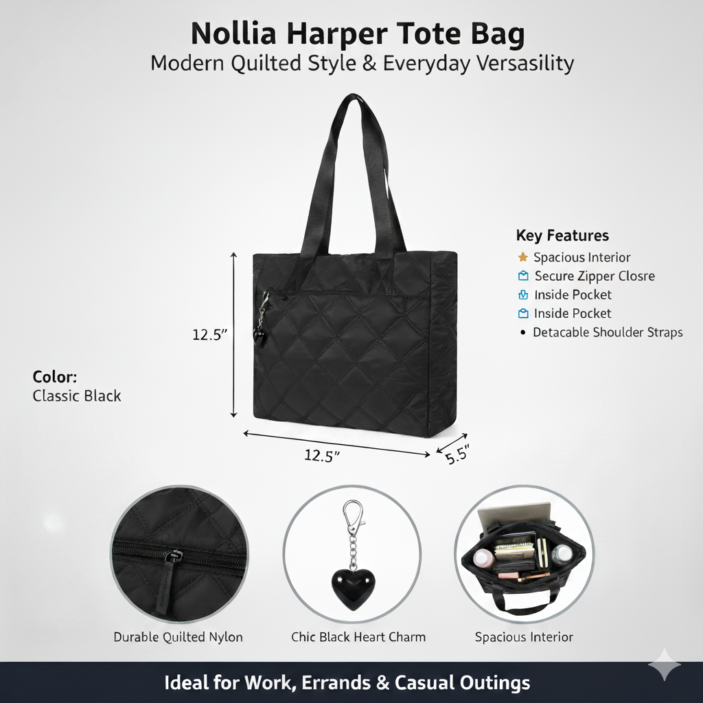 The Nollia Harper Tote Bag offers a clean, modern quilted look with everyday versatility. Made from durable nylon, this tote boasts a sleek diamond-stitched finish and sturdy straps, perfect for daily wear. Its spacious interior and secure zipper closure make it practical, while the glossy black heart charm adds a touch of elegance. Ideal for work, errands, or casual outings.
