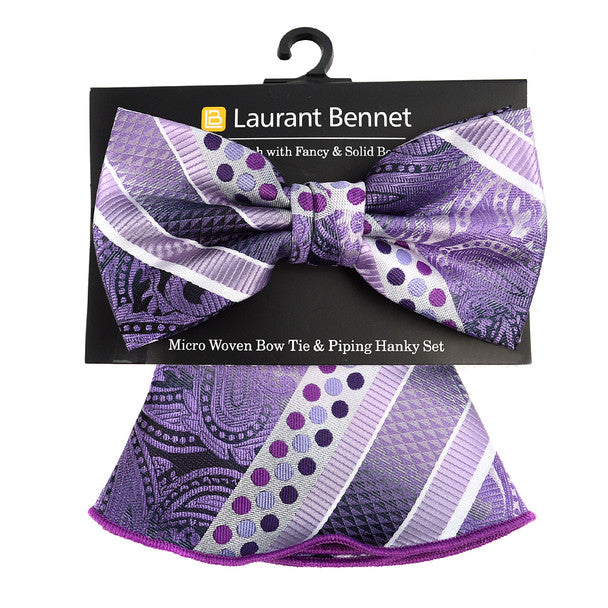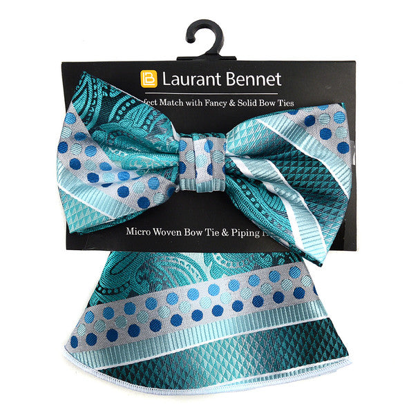 Add flair to any formal ensemble with this bold geometric paisley bow tie and matching pocket round from Laurant Bennet. Designed for effortless elegance, the vibrant color patterns and piped round hanky create a standout accessory set that stays perfectly shaped in your jacket pocket.