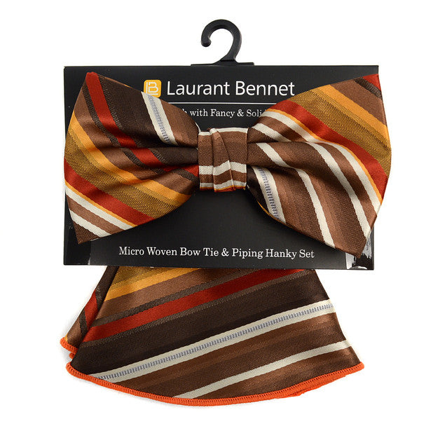 Make a statement with the Laurant Bennet Bold Stripes Bow Tie and Matching Pocket Round Set. Featuring vivid multicolor stripes and a piped edge round hanky, this set adds visual energy and sophistication to any formal or semi-formal outfit. The easy-to-style banded bow tie and structured pocket round combine to offer a refined and eye-catching finishing touch.