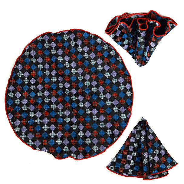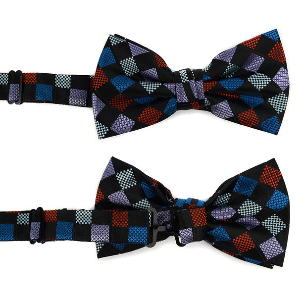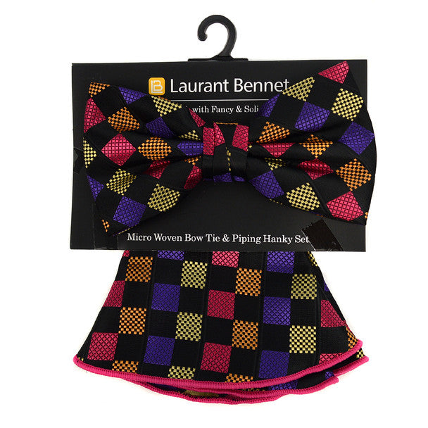 Elevate your formal look with this bold Checkered Pattern Banded Bow Tie & Matching Pocket Round Set from Laurant Bennet. Featuring a striking mix of colors and a polished checkered design, this set delivers both charm and distinction. The hand-finished piped pocket round keeps its flower-like form with ease, adding a refined finishing touch to any suit. Ideal for weddings, galas, and standout style moments.