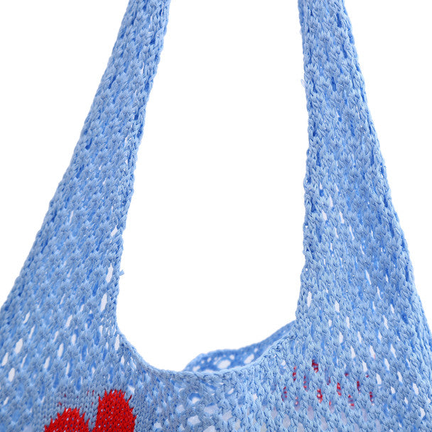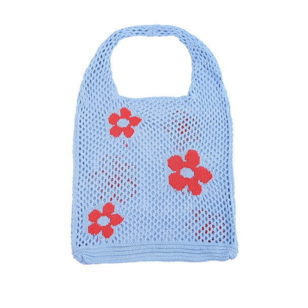 Brighten up your day with the Nollia Blue Floral Crochet Knit Bag. Featuring a breathable blue crochet base with playful red flower designs, this tote blends lightweight comfort with standout style. It’s the perfect casual accessory for warm days, shopping trips, or spontaneous outings.