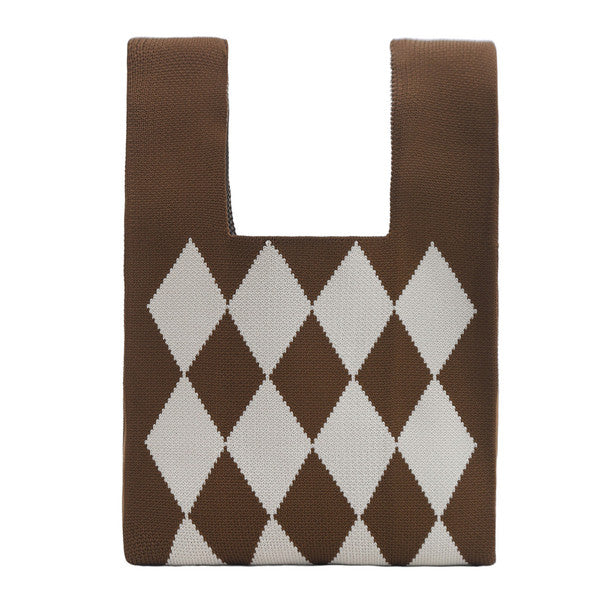 Checkout our new Nollia Mini Knit Tote Bag, a blend of fashion and function. Featuring a classic argyle pattern in a rich brown colorway, this tote adds timeless charm to your everyday look.