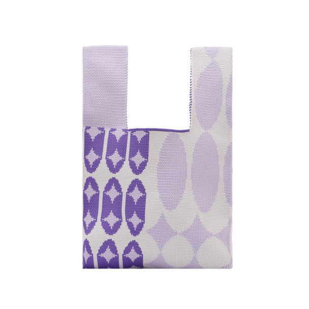 Checkout our new Nollia Mini Knit Tote Bag, a blend of fashion and function. This eye-catching design features layered abstract shapes in soft lavender and bold purple tones, combining modern style with artistic flair.