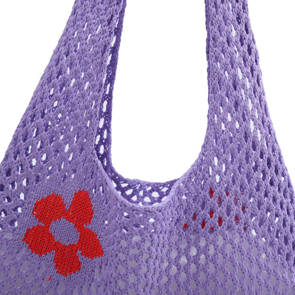 Freshen up your style with the Nollia Purple Floral Crochet Knit Bag. Designed with a breathable purple crochet knit and charming red floral accents, this tote is a stylish and lightweight companion for your everyday adventures. Ideal for sunny days, errands, or weekend getaways.