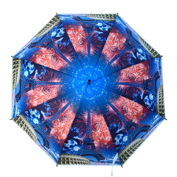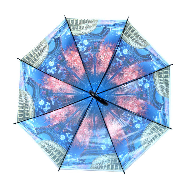 Brighten your rainy days with the Parquet Europe Scenery Fireworks Umbrella. Designed with a transparent plastic canopy showcasing a stunning European skyline and fireworks display, this umbrella adds charm and visual flair while keeping you dry. The auto open mechanism offers fast, one-handed use, while the strong center pole and 8-rib construction provide durability in windy conditions. Lightweight and easy to carry, it’s finished with a classic J-shaped plastic handle for comfort and grip.
