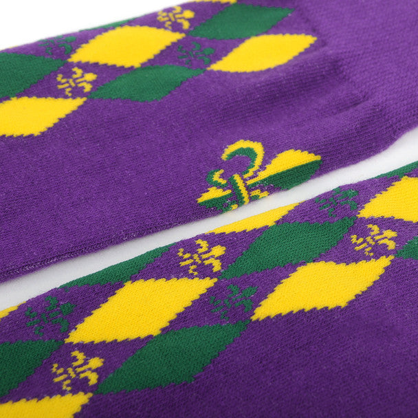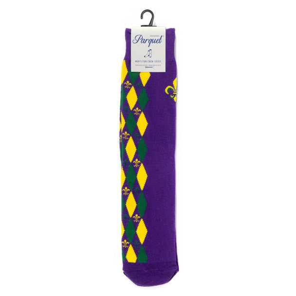 Parquet Men’s Mardi Gras Novelty Crew Socks – Purple with Green & Yellow Design
