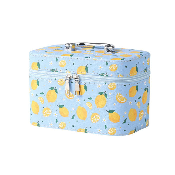 Add a splash of summer to your beauty routine with this Medium Lemon Print Makeup Train Case in a charming baby blue! Compact yet spacious, this adorable toiletry case features a playful lemon and daisy pattern, perfect for brightening up your vanity or travel kit.